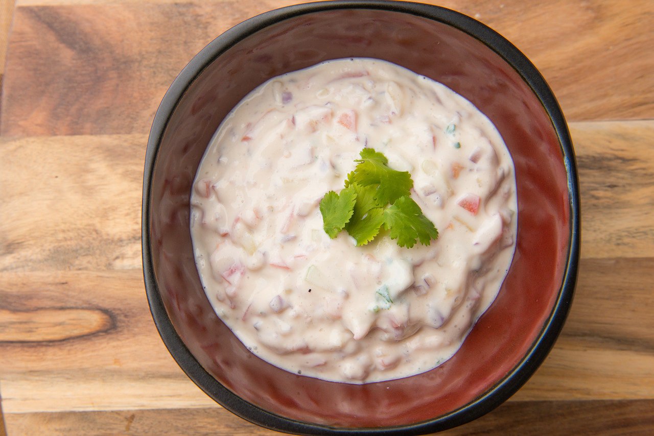 Yogurt dip goes well with any flavoured rice dish, pilaf or biryani.MethodMix all the ingredients except tofu in a bowl. Separately blend the soft tofu in a blender or food processor until you ge...